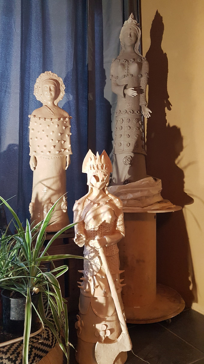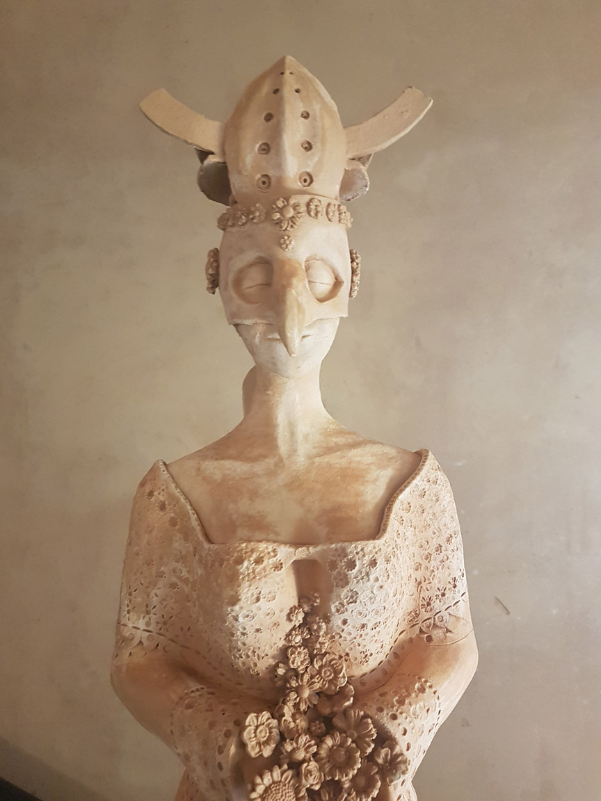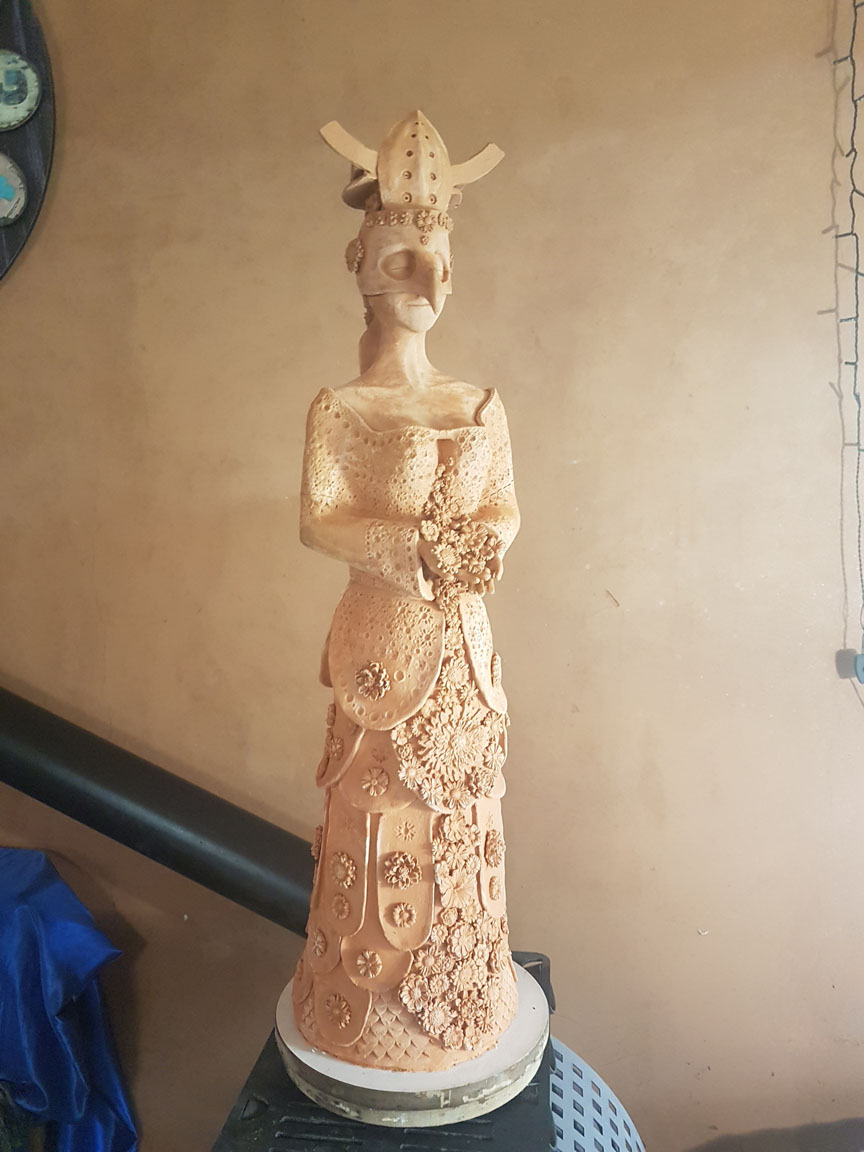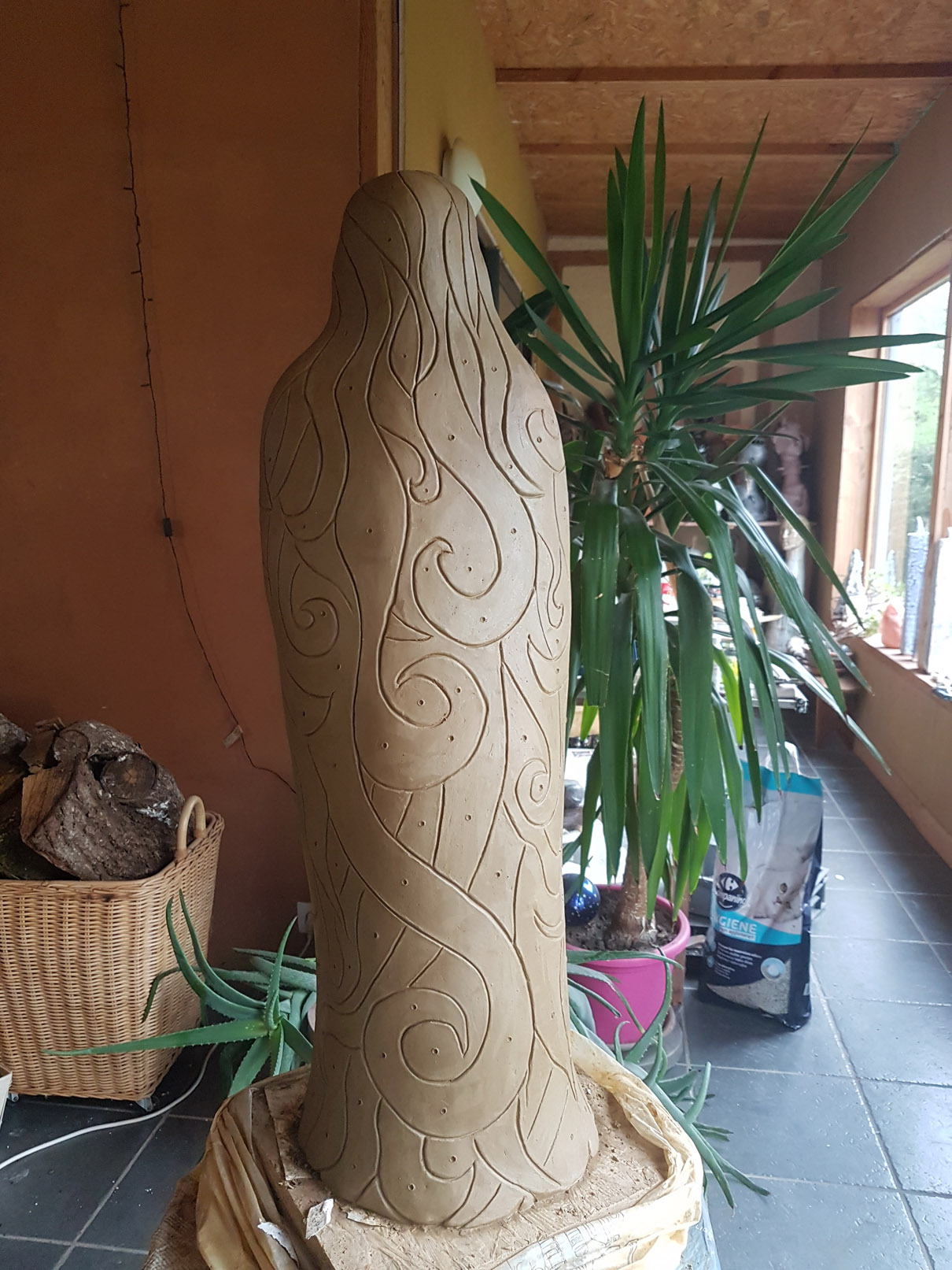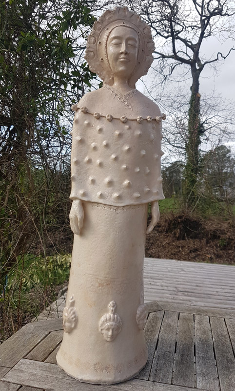Cette série, débutée en 2024, représente des personnages en pied, entre 80 et 95 cm de haut. La base est un grès blanc sur lequel j’ai posé un engobe vitrifié au kaolin de la carrière voisine de Plœmeur (56). Pour l’une d’elle, c’est une terre locale à laquelle j’ai rajouté des restes d’émail. Les Mystiques peuvent faire penser à la statuaire des églises, effectivement j’aime beaucoup visiter les églises et suis très touché par l’art sacré. Ici ce ne sont pas vraiment des personnages religieux, mais des personnages plutôt mystérieux, desquels émane, je l’espère, une certaine sagesse, une atmosphère de paix …