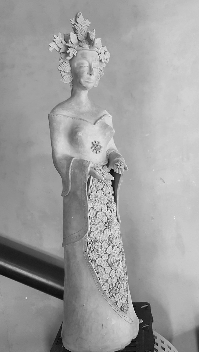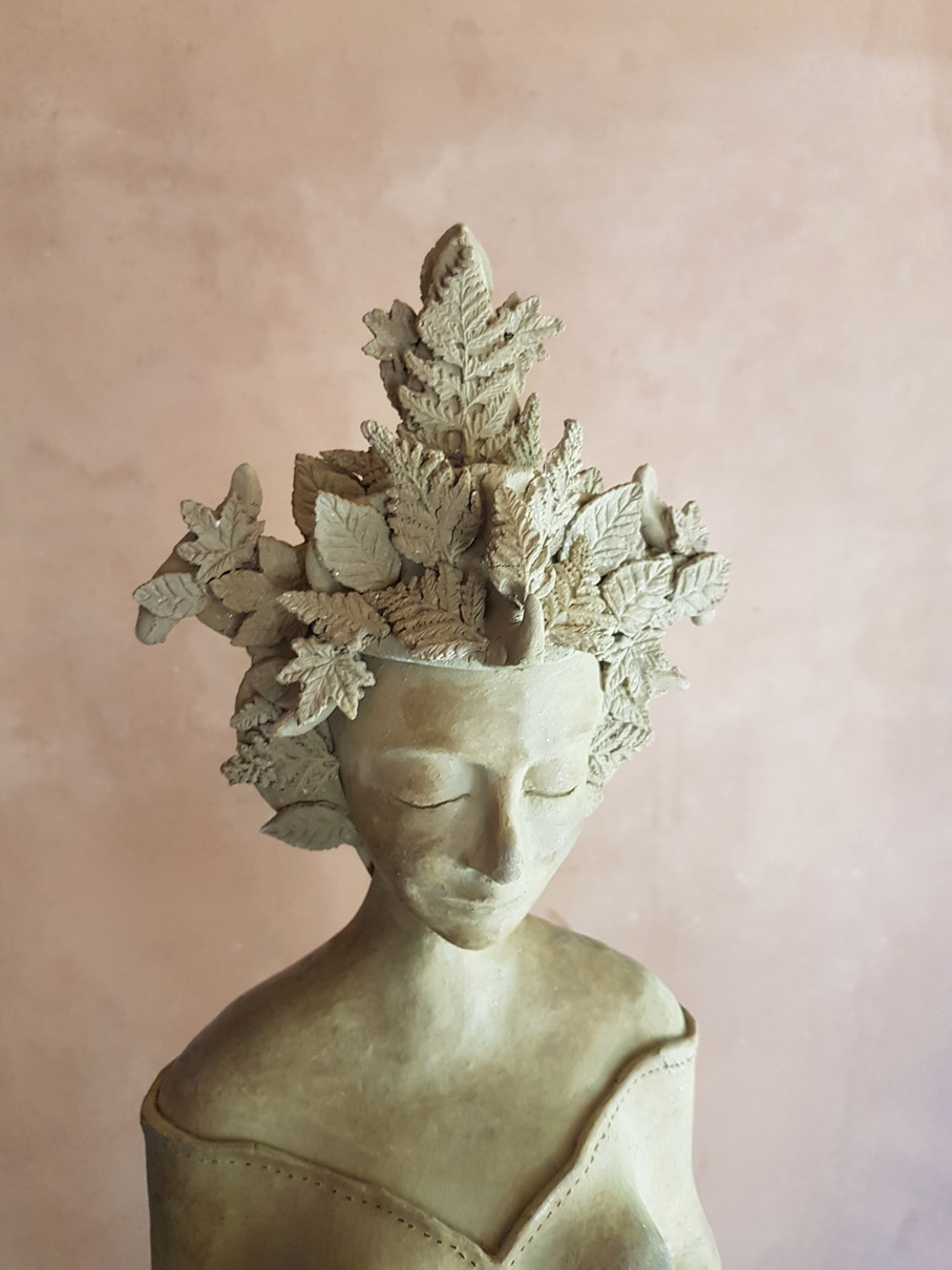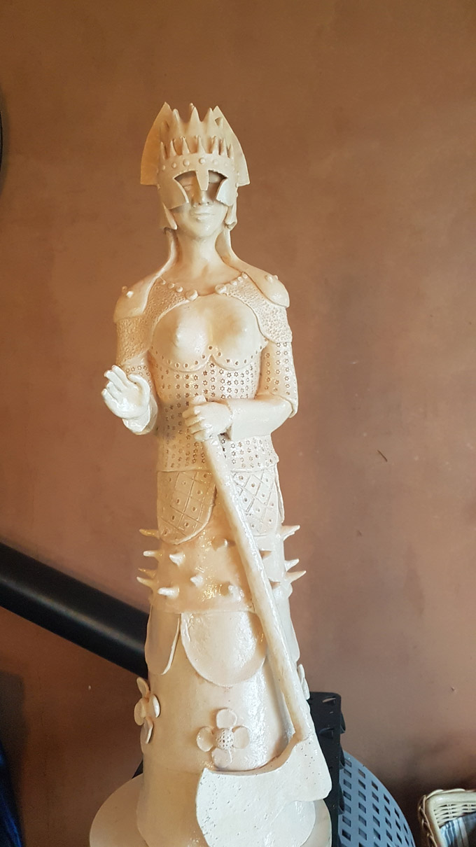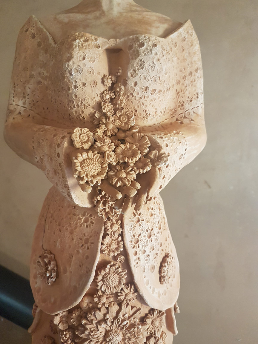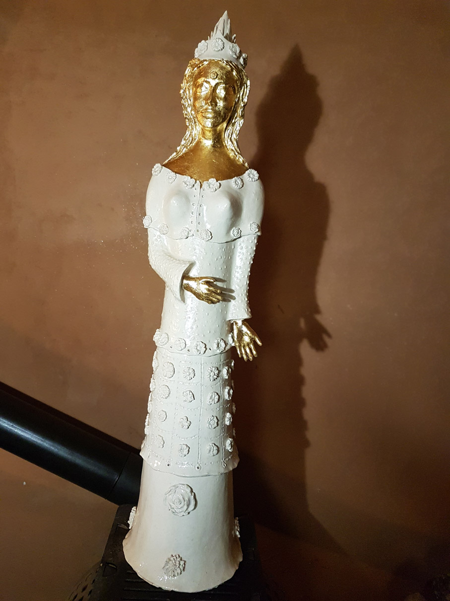 Cette série, débutée en 2024, représente des personnages en pied, entre 80 et 95 cm de haut. La base est un grès blanc sur lequel j’ai posé un engobe vitrifié au kaolin de la carrière voisine de Plœmeur (56). Pour l’une d’elle, c’est une terre locale à laquelle j’ai rajouté des restes d’émail. Les Mystiques peuvent faire penser à la statuaire des églises, effectivement j’aime beaucoup visiter les églises et suis très touché par l’art sacré. Ici ce ne sont pas vraiment des personnages religieux, mais des personnages plutôt mystérieux, desquels émane, je l’espère, une certaine sagesse, une atmosphère de paix …