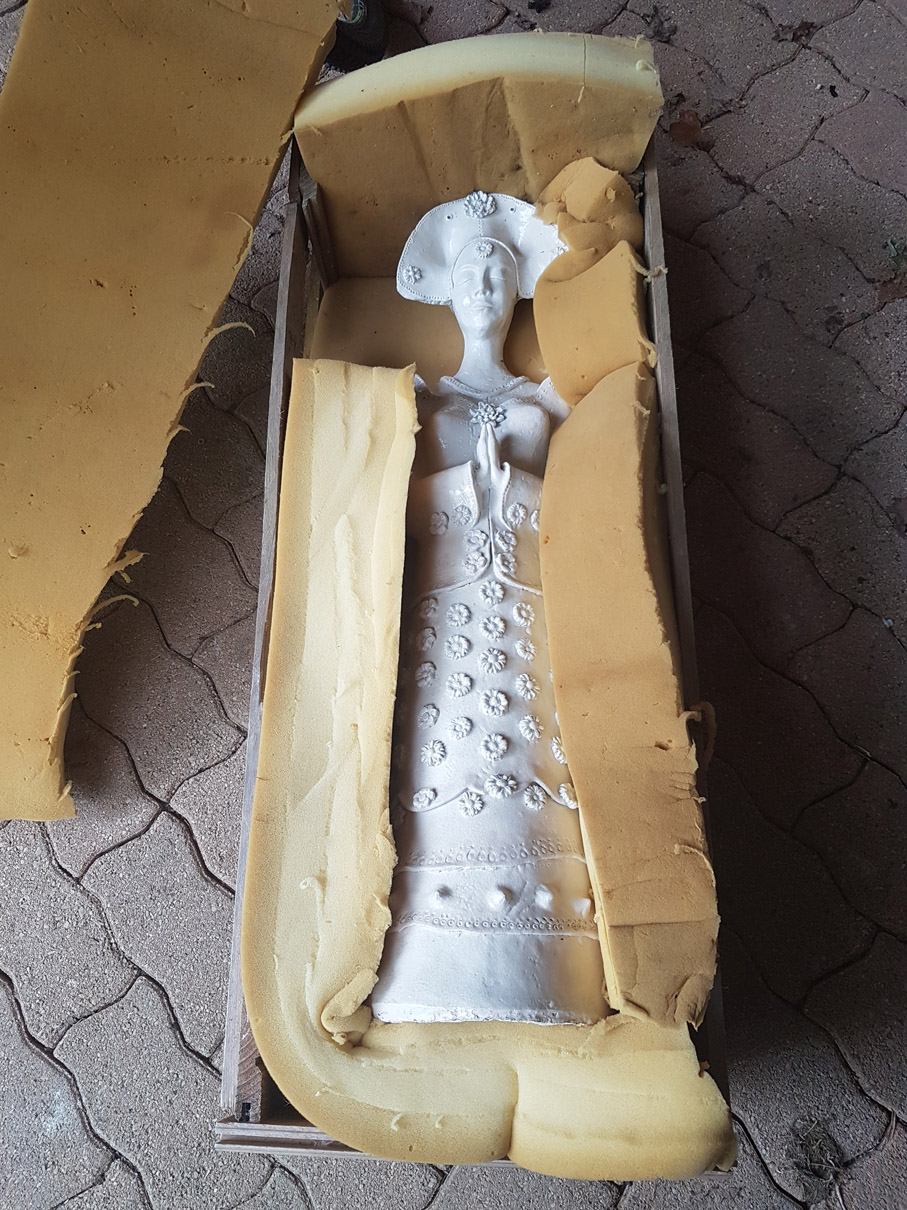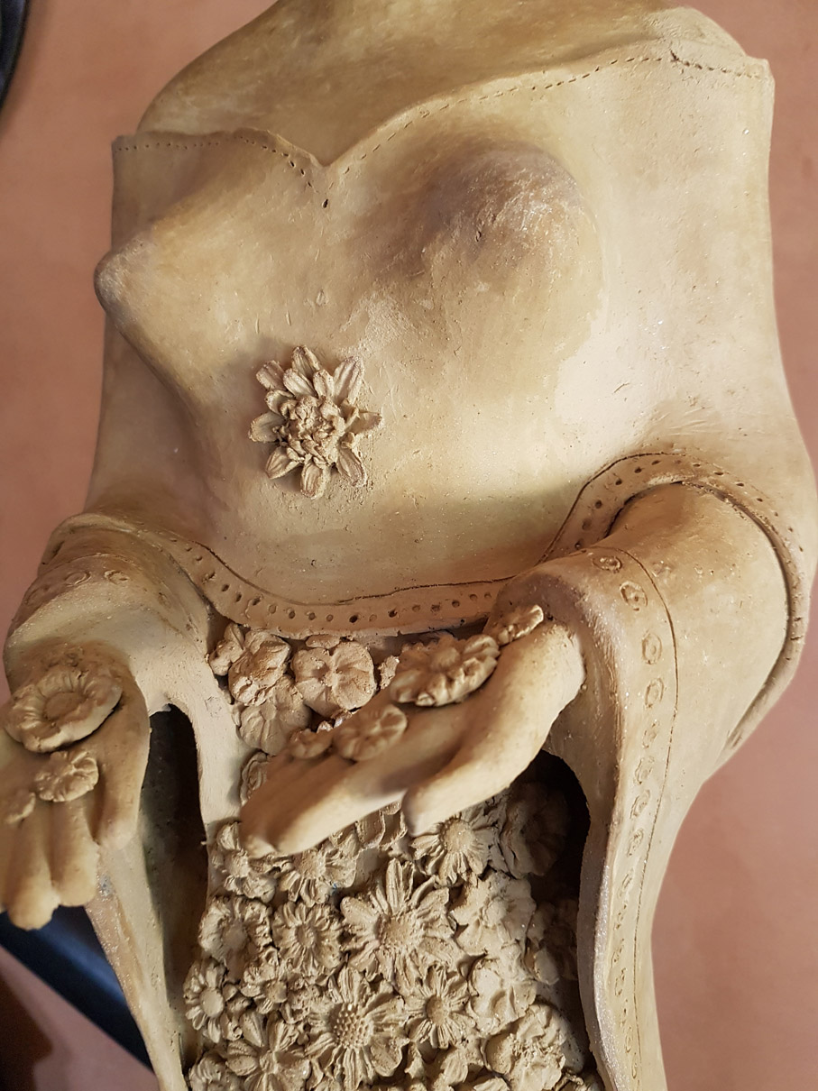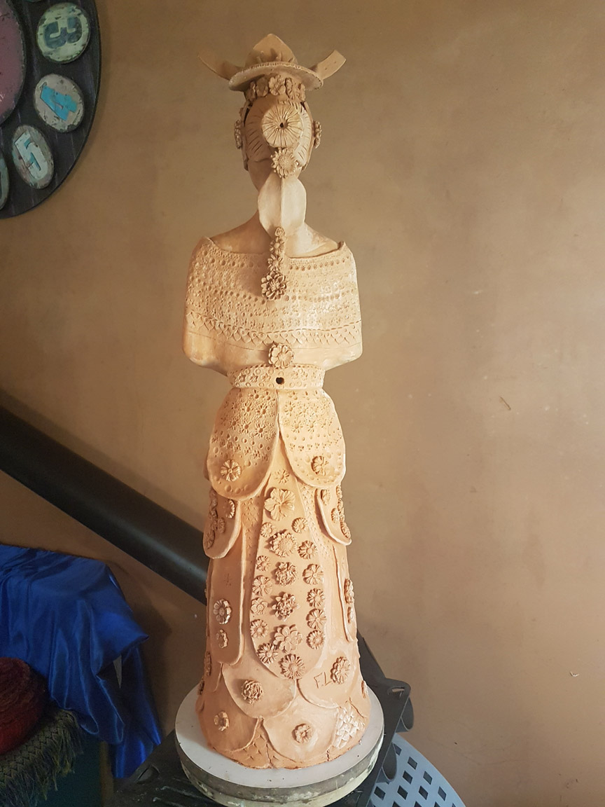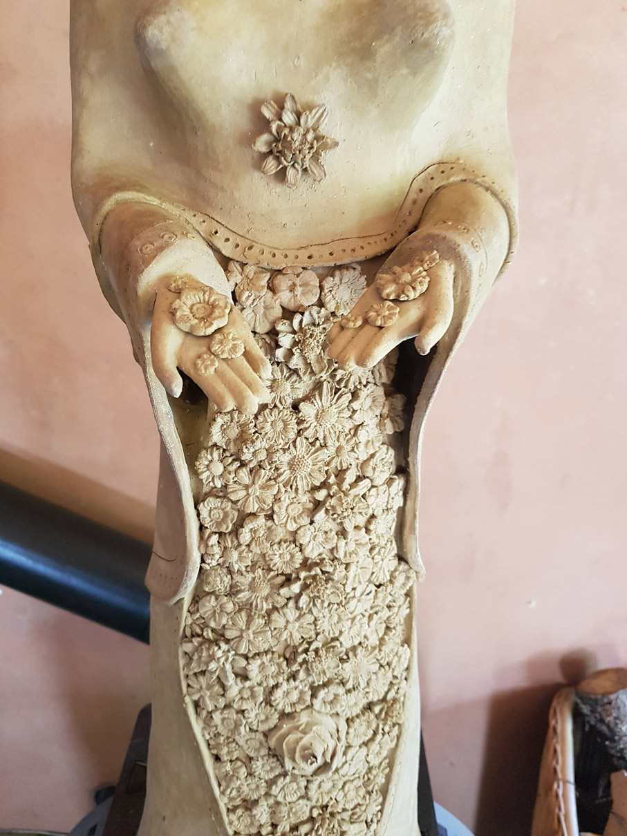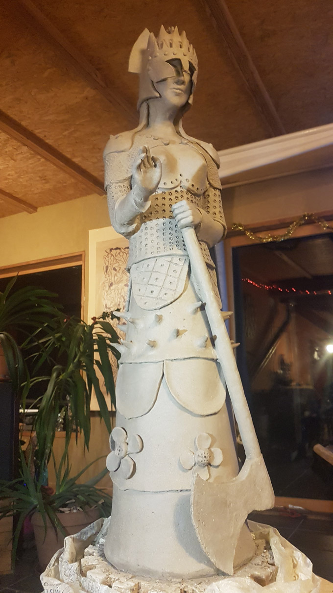 Cette série, débutée en 2024, représente des personnages en pied, entre 80 et 95 cm de haut. La base est un grès blanc sur lequel j’ai posé un engobe vitrifié au kaolin de la carrière voisine de Plœmeur (56). Pour l’une d’elle, c’est une terre locale à laquelle j’ai rajouté des restes d’émail. Les Mystiques peuvent faire penser à la statuaire des églises, effectivement j’aime beaucoup visiter les églises et suis très touché par l’art sacré. Ici ce ne sont pas vraiment des personnages religieux, mais des personnages plutôt mystérieux, desquels émane, je l’espère, une certaine sagesse, une atmosphère de paix …